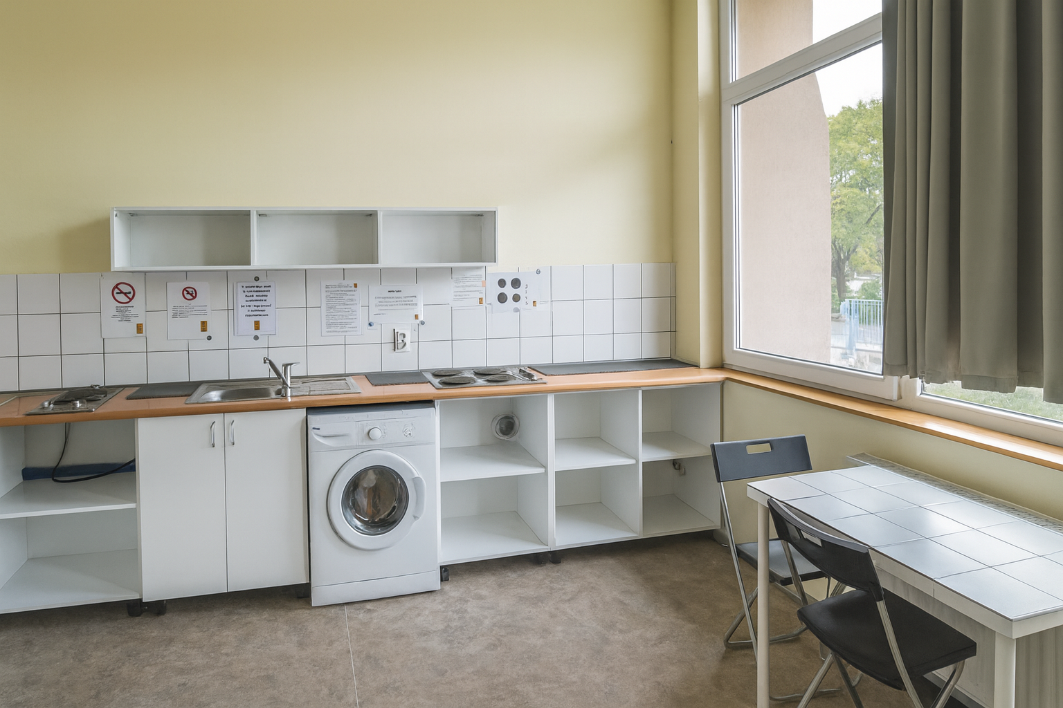 Az épületben a Staff House standard felszereltsége szerint kerültek kialakításra a szobák, közösségi fürdővel. A központi konyhában sütni, főzni lehet. A mosókonyhában térítésmentesen mosó- és szárítógépek állnak rendelkezésre. WiFi (internet csatlakozás) a teljes épületben ingyenes biztosított.
