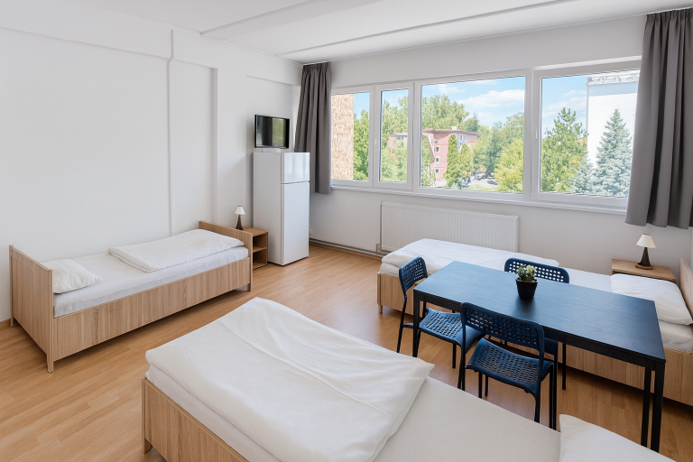 Az épületben kialakított szobák a Staff House standard felszereltségének megfelelőek, központosított vizesblokkban, szobákhoz dedikált fürdőszobák állnak rendelkezésre. Közös használatú konyhán túl mosókonyha és közösségi tér is kialakításra került.